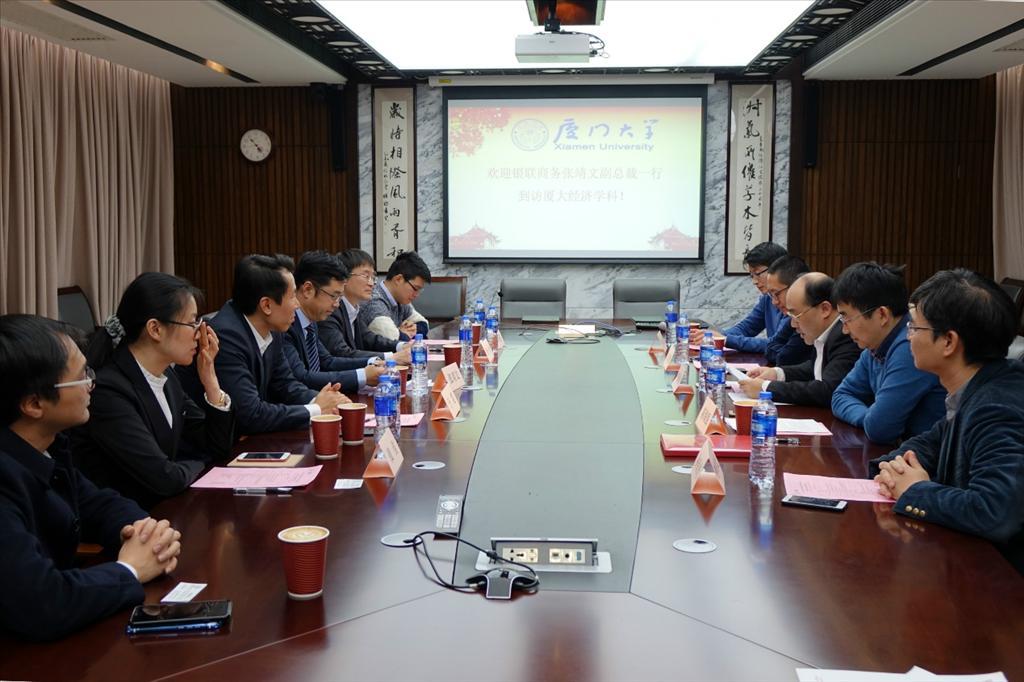 12月20日,厦大经济学科与银联商务战略合作协议续签仪式在经济楼N501举行。银联商务副总裁张靖文、业务管理部总经理兼大数据项目组兼天天富项目组总经理于震,银联商务厦门分公司总经理方一兴、业务管理部助理总经理兼大数据项目组副总经理钱佳、大数据业务项目组产品总监徐伟男,以及厦大经济学科周颖刚、许文彬、陈海强、钟威、钟锃光等老师参加了仪式。